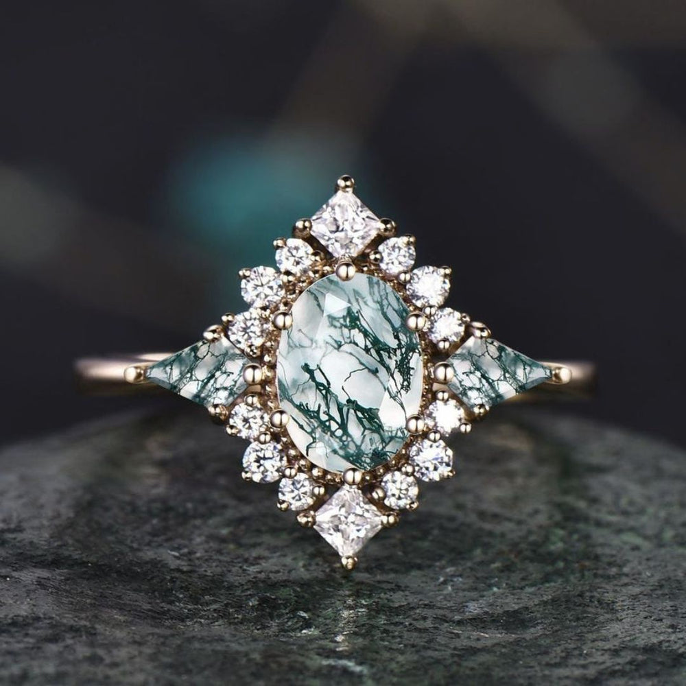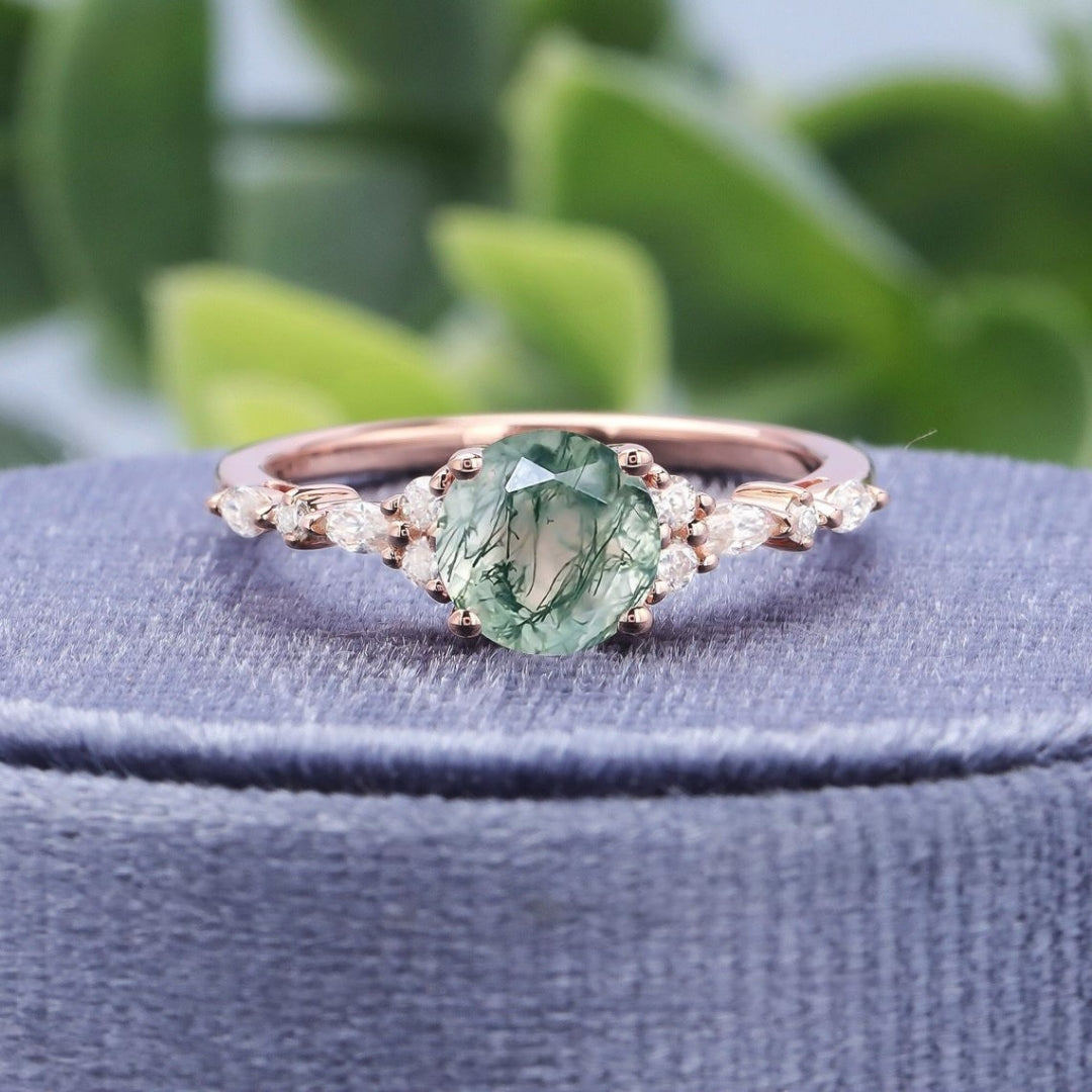 Embrace the charm of nature with our Moss Agate Diamond Ring a unique fusion of organic beauty and classic luxury. Each moss agate stone features natural green inclusions resembling a miniature forest, making every ring truly one of a kind.