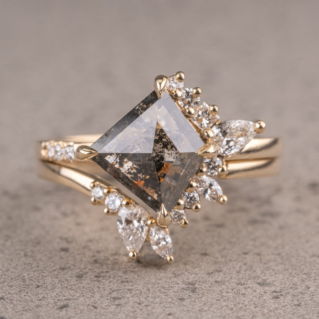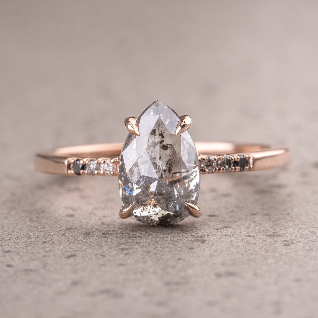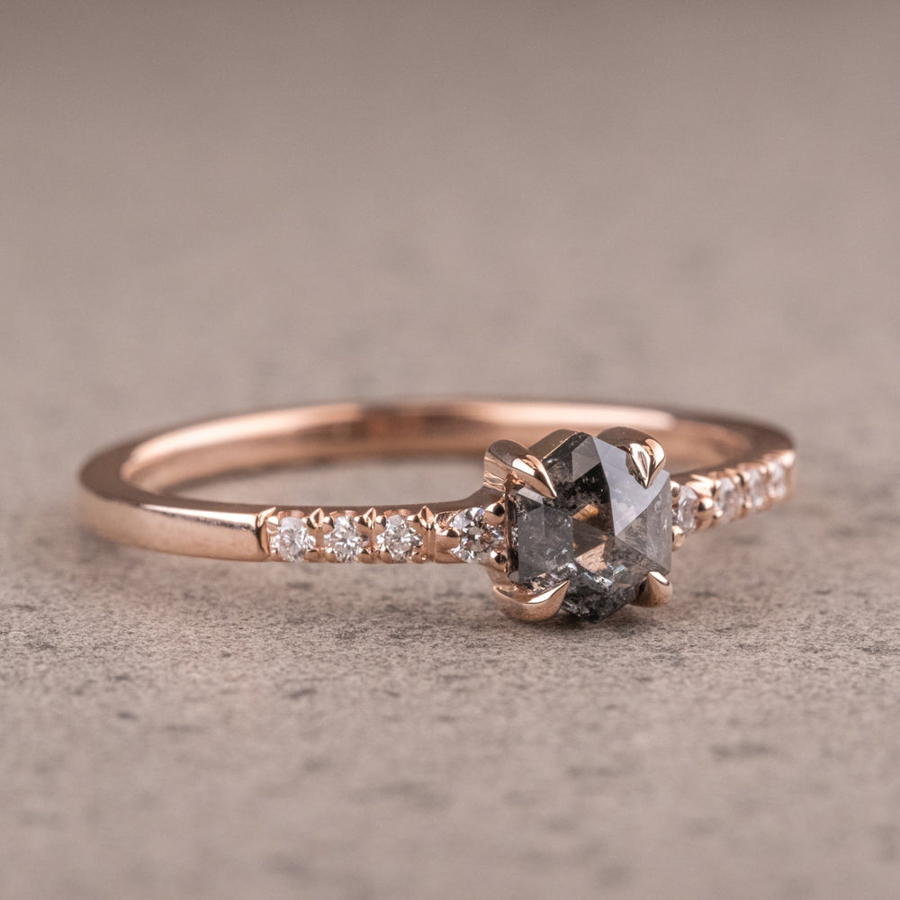 Elevate Your Jewelry Collection With Our Exquisite Natural Salt And Pepper Side Stone Ring, A Harmonious Blend Of Elegance And Individuality. This Ring Features A Captivating Natural Salt And Pepper Diamond At Its Center, Celebrated For Its Unique Inclusions And Smoky Allure, Making Each Piece A One-of-a-kind Treasure.