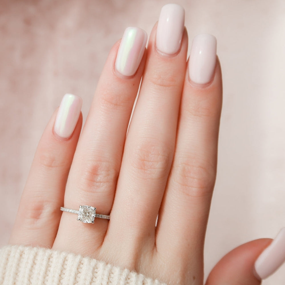 Tessa, A Businesswoman, And Ariel, Trapped In An Elevator, Made Awkward Small Talk. Tessa Noticed Ariel's Moissanite 1.95 Ct Cushion Cut Diamond Avant Garde Engagement Ring And Asked If It Was An Engagement Ring. Ariel Revealed His Fiancée Had Given It To Him Before He Left For The Trip. Tessa Felt A Pang Of Jealousy, Wanting A Love Like That.