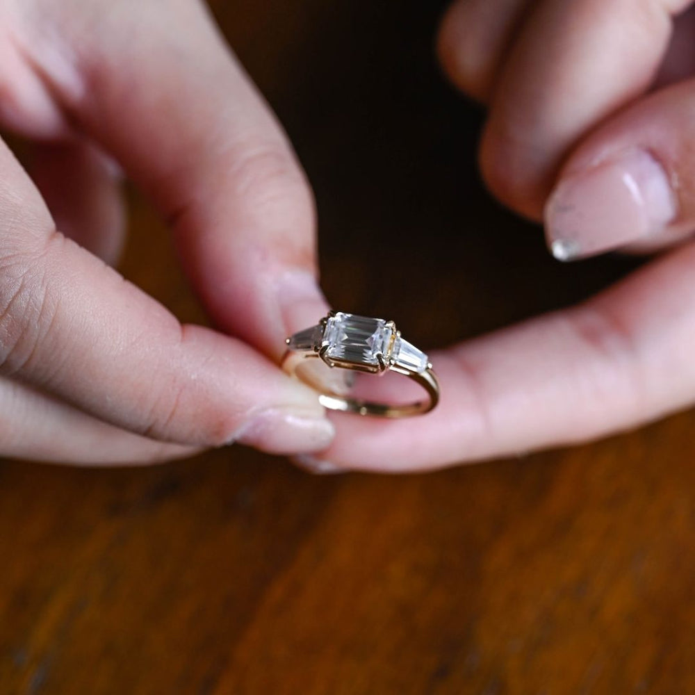 Adrian, A Passionate Jewelry Designer, Created The Moissanite 3.22 Ct Emerald Cut Diamond Avant Garde Engagement Ring. Adeline, An Art Curator, Admired The Ring At An Exclusive Exhibition. Their Paths Crossed At An Art Gallery Event, Where Adrian's Masterpiece Was Being Showcased.